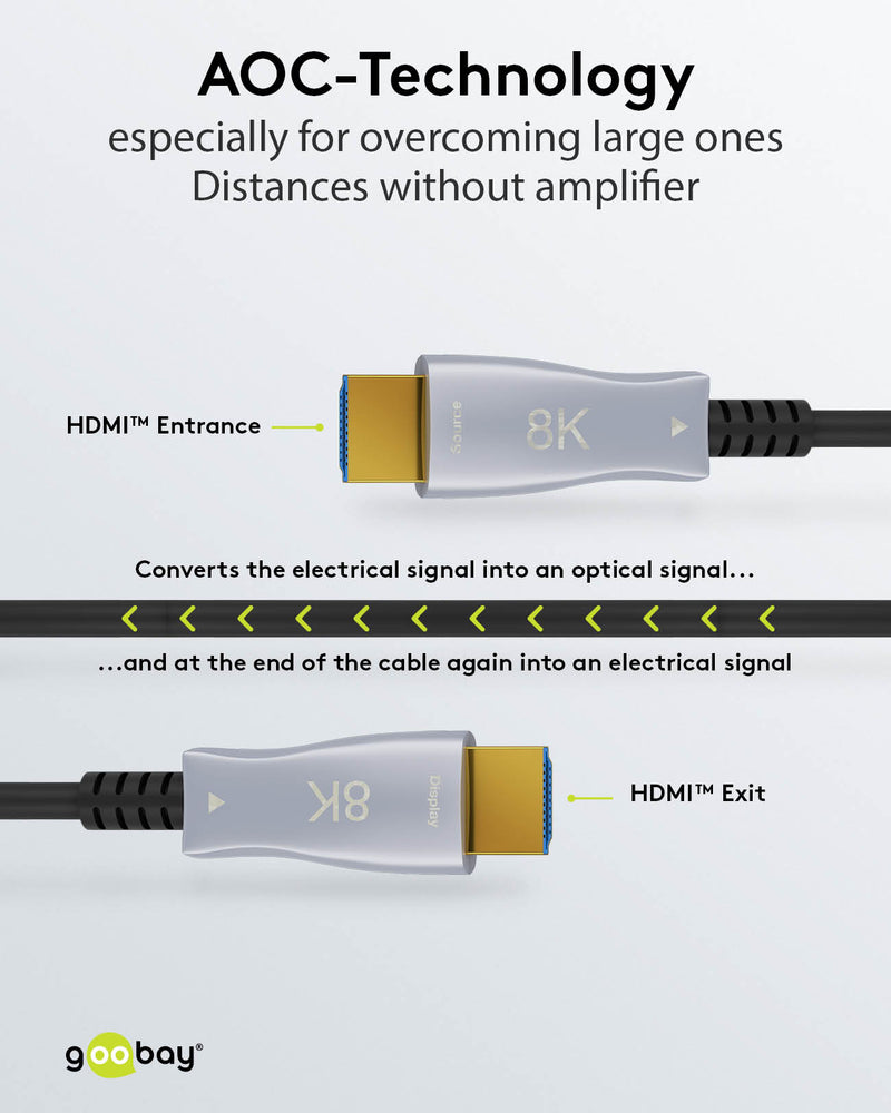 • The 8K fibre-optic cable covers long distances thanks to AOC technology. It provides optimum transmission speed and low susceptibility to interference in long cable runs without amplification.