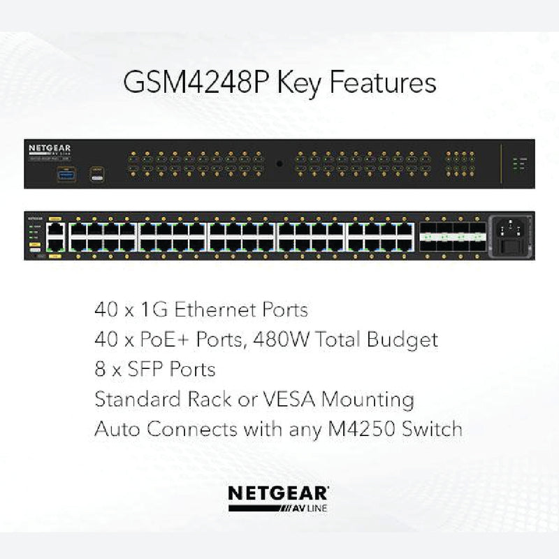 The NETGEAR AV Line of M4250 Switches, developed and engineered for audio/video professionals with dedicated service and support. M4250 has been built from the ground up for the growing AV over IP market, combining years of networking expertise in AV with M4300 and M4500 series with best practices from leading experts in the professional AV market. AV codecs generally use 1Gbps or 10Gbps per stream and the AV Line of M4250 targets the widespread 1Gbps codecs. PoE+, Ultra90 PoE++ and rear-facing ports ensure a clean integration in AV racks. M4250 switches come pre-configured for standard audio and video signals.