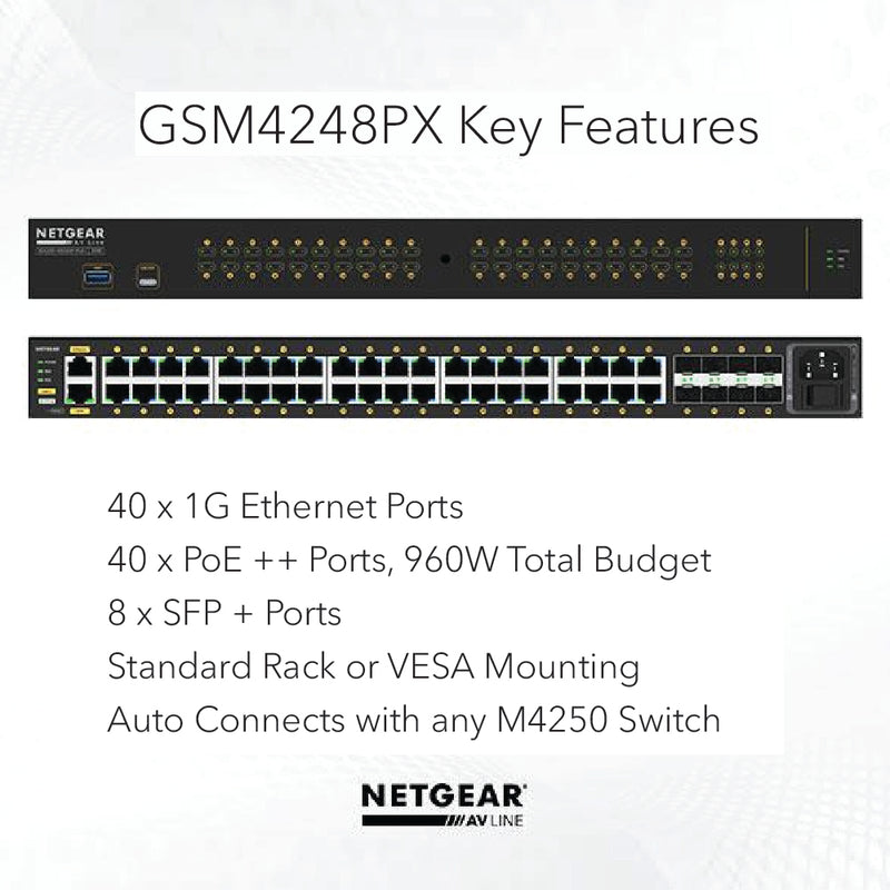 The NETGEAR AV Line of M4250 Switches, developed and engineered for audio/video professionals with dedicated service and support. M4250 has been built from the ground up for the growing AV over IP market, combining years of networking expertise in AV with M4300 and M4500 series with best practices from leading experts in the professional AV market. AV codecs generally use 1Gbps or 10Gbps per stream and the AV Line of M4250 targets the widespread 1Gbps codecs. PoE+, Ultra90 PoE++ and rear-facing ports ensure a clean integration in AV racks. M4250 switches come pre-configured for standard audio and video signals.