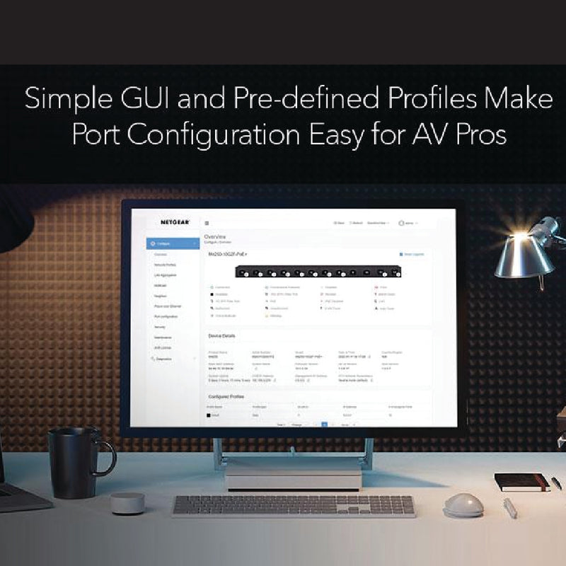The AV-oriented, web-based GUI permits factory or user-specified profiles to be assigned to individual ports as needed.