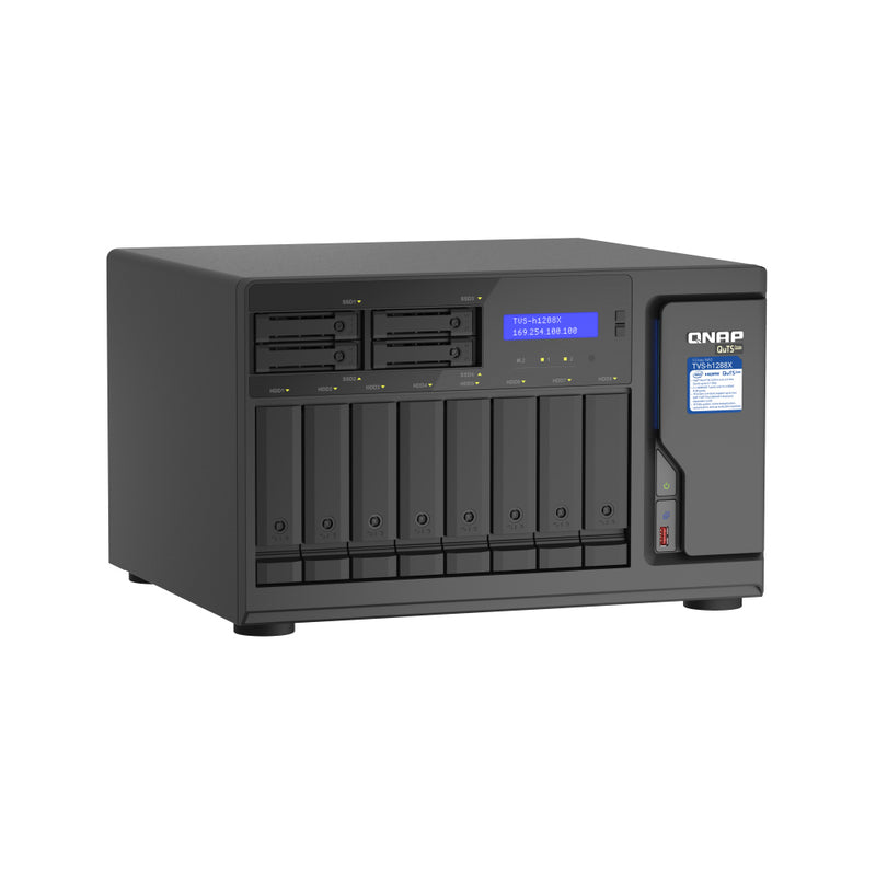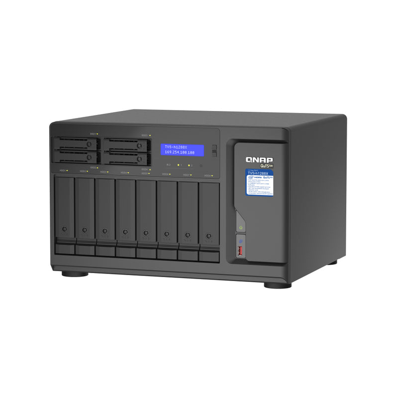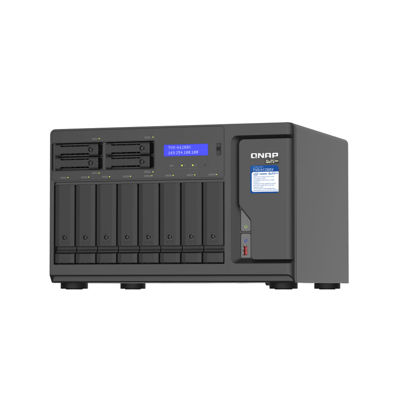 The high-capacity TVS-h1288X features a powerful Intel® Xeon® W processor and allows for installing two QNAP QXP-T32P Thunderbolt™ 3 PCIe expansion cards (sold separately) to attain four Thunderbolt™ 3 ports, making it a perfect match for Thunderbolt™-equipped Mac® and Windows® users for high-speed media collaboration. The built-in 10GbE and 2.5GbE connectivity supports Port Trunking and failover to further satisfy bandwidth and reliability demanding business applications. Running the ZFS-based QuTS hero operating system, the TVS-h1288X supports block-level inline data deduplication and compression, near-limitless snapshots, real-time SnapSync, and read/write cache technologies, helping your business achieve reliable service-level agreement performance, from creative workflows to file server, virtualization server, and efficient file backup and recovery applications.