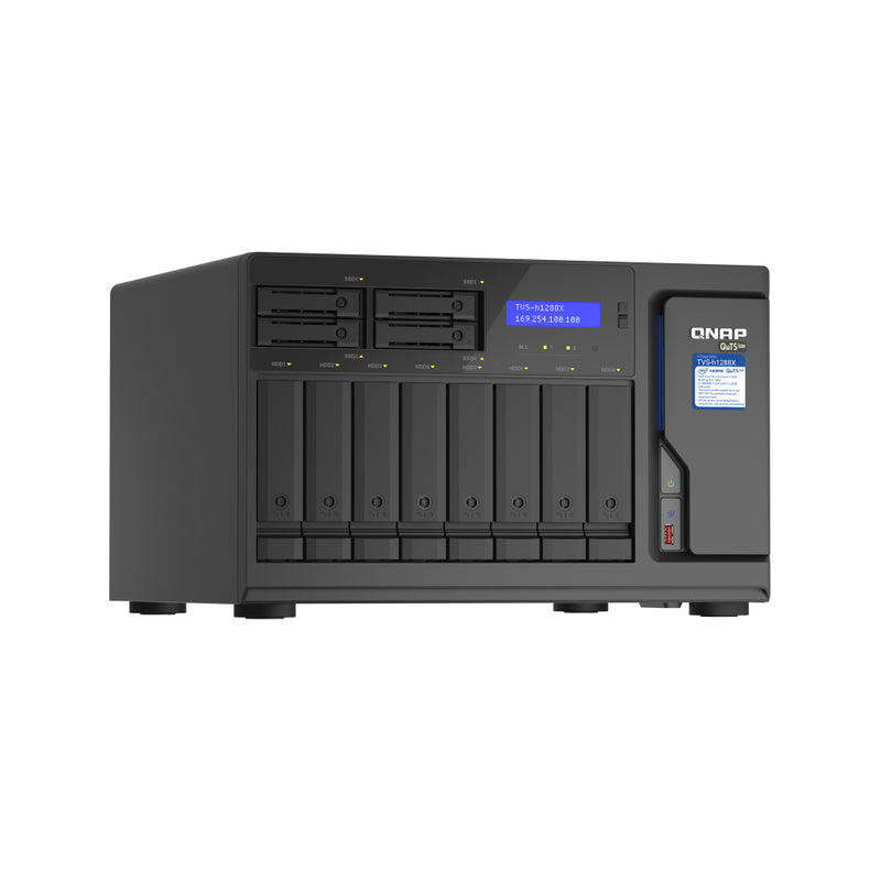 The TVS-h1288X comes with four 2.5-inch SATA 6Gb/s drive bays for SSDs and two M.2 NVMe Gen 3 x4 SSD slots that allow you to flexibly configure SSD caching to increase IOPS performance, reduce storage volume latency, and optimize 2.5GbE/10GbE performance. This is especially perfect for databases and virtual machine applications. With dedicated SSD bays/slots, the TVS-h1288X allows you to dedicate all of the 3.5-inch drive bays for high-capacity hard drives, ensuring both maximized storage capacity and performance.